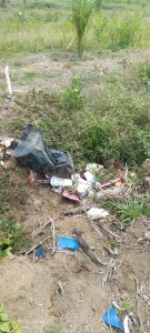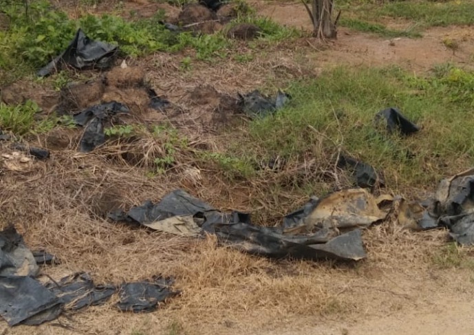 Ratusan Plastik Polybag Bekas bibit sawit tampak dibiarkan berserakan mengotori lahan.